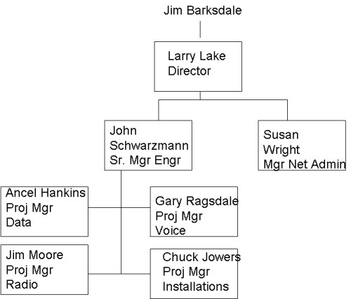 Larry Lake was the Director of Telecom. Reporting to him was the organization listed above. Sometime around 1983, Larry left the company opening up this position. Winn, who was a manager over communications software in Computer Operations won the job. Winn had worked at Cook,and had left with many others as that company tettered on bankruptcy. He took a manager position after the 40 Cook people came over with the IBM systems. Between 1983 till his retirement around 2004, Winn ran the Telecom department except for a couple years when he was the CIO/COO of Caliber Technoligies. I worked for Winn for 15 of my 28 years at FedEX. Under Ron Ponder, Dennis Jones and Rob Carter many developments were completed as Winn's responsiblities evolved to not only Telecom, but Publishing, training, Powership software development, data security,scanning, hardware development and eventually all the technology architecture and support at FedEX. Although this was initially a Telcom group, it expanded to many other facets including, which were all under Winn: