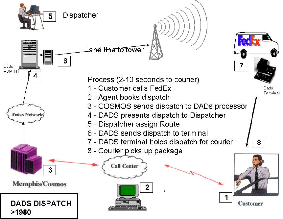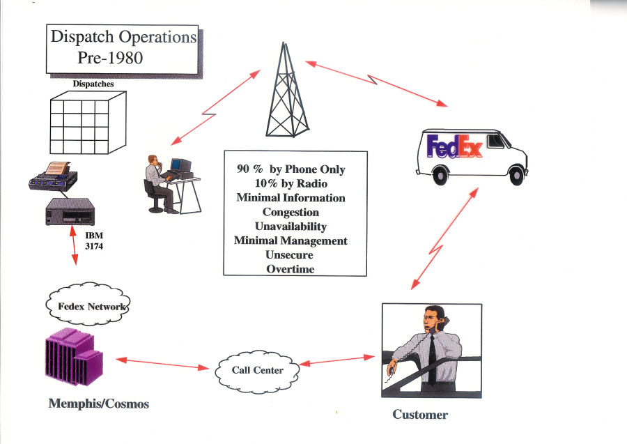 I witnessed an amazing feat my first week at FedEX. Jim would sit behind the computers and start screen 1, while Jim Moore would start discussing the future of the system and do a demo. After explaining the system a few minutes and talking about the first screen, Jim would give a queue to Jim Bentley, who would Stop the screen 1 application and start Screen 2 application; with synchronized timing...Jim would push a key and the other screen would pop up....jim would assign a dispatch number...and a manual message had been queued to go to an MDI terminal on the radio.